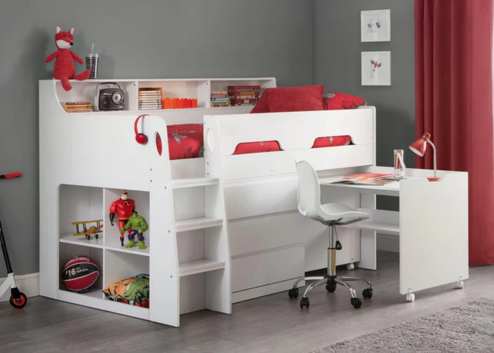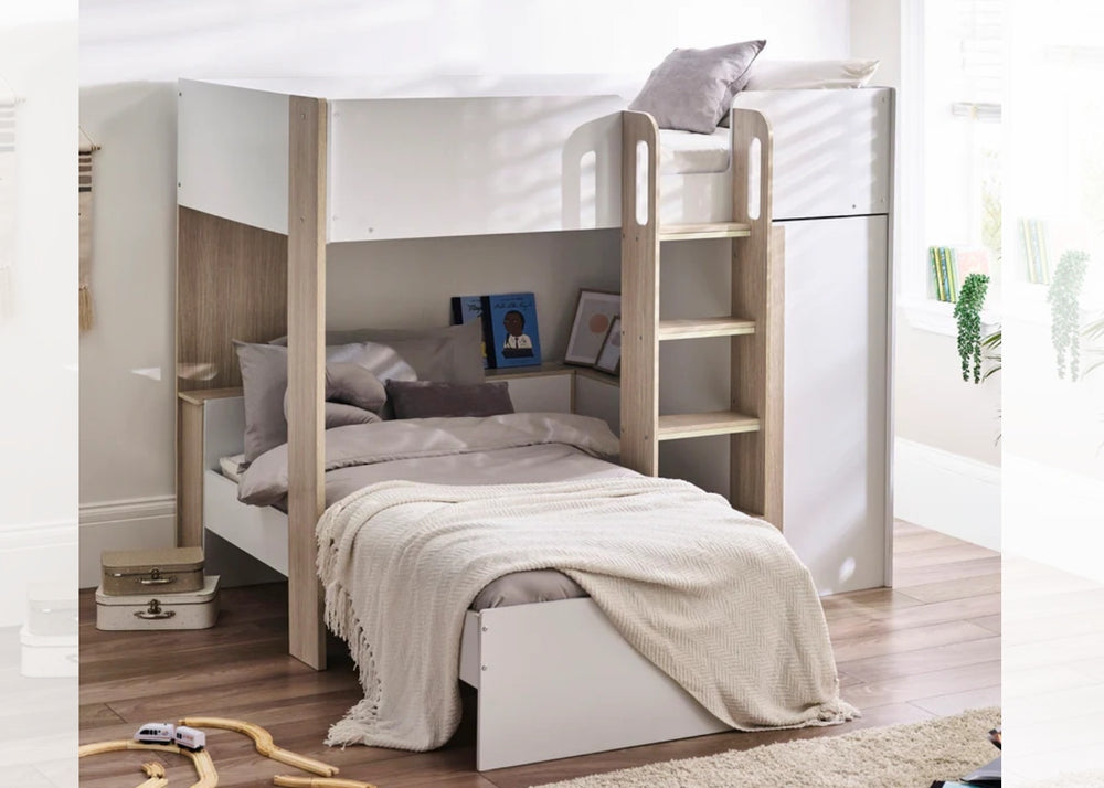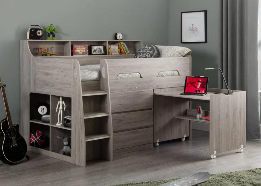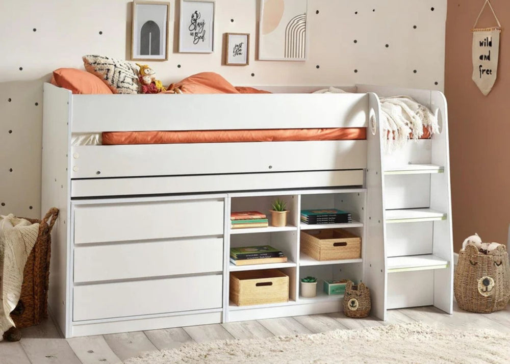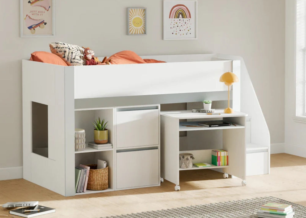 Mid sleepers sit slightly higher than a single but lower than a bunk. They often offer built-in storage or play areas underneath which help keep bedrooms tidy and organised. They are best from around age five onwards, depending on your child’s confidence with steps.
