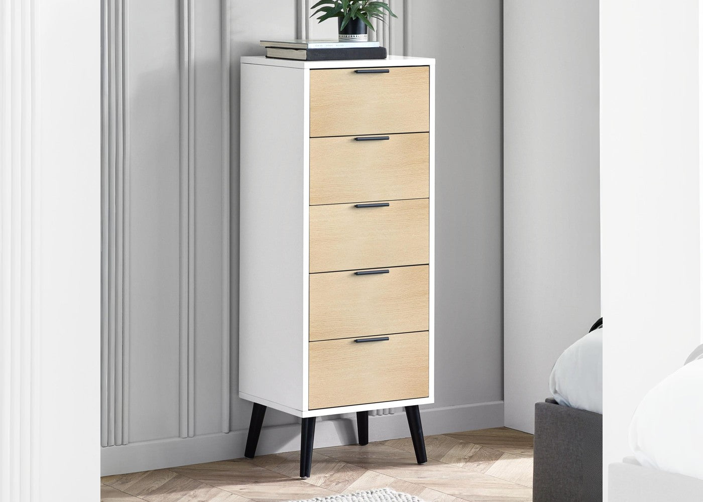The Alba 5 Drawer Chest by Julian Bowen is a practical chest of drawers designed for everyday use. It offers functional storage while maintaining a clean and versatile appearance. It is available in Silk grey, Walnut black and White oak.