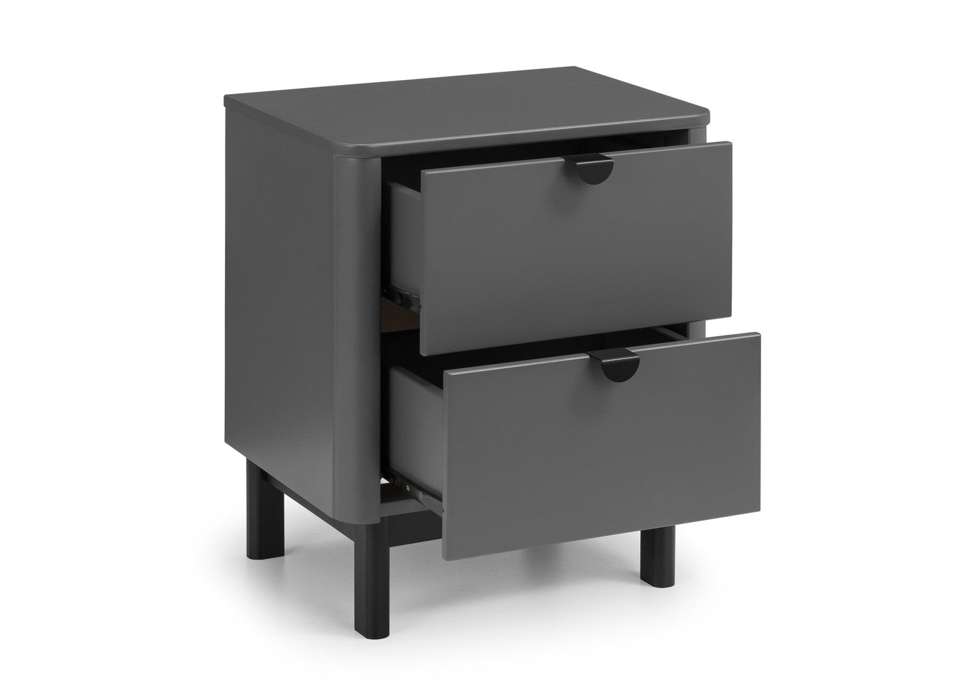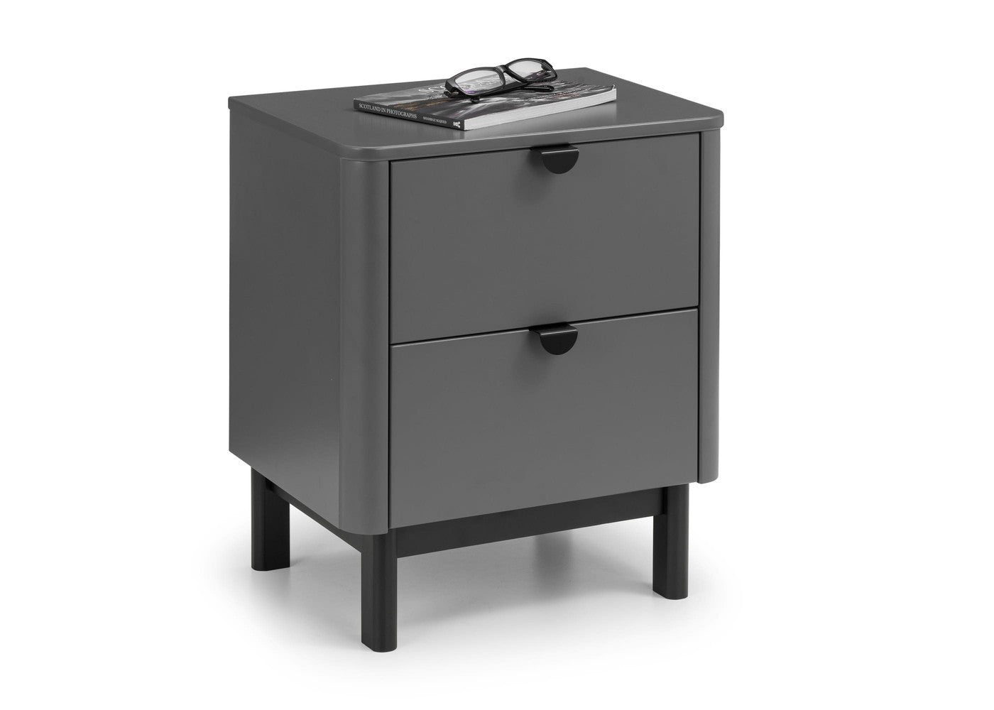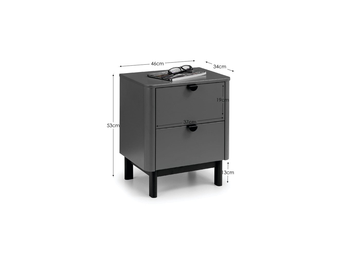 The Chloe Bedside brings a stylish modern retro touch to your bedroom, featuring a smooth storm grey lacquered finish complemented by satin black wooden legs and handles. Its softly rounded corners add a gentle, contemporary feel, creating a perfect balance between aesthetics and everyday functionality. This elegant design fits effortlessly into a range of interior styles, making it a versatile and attractive bedside companion.