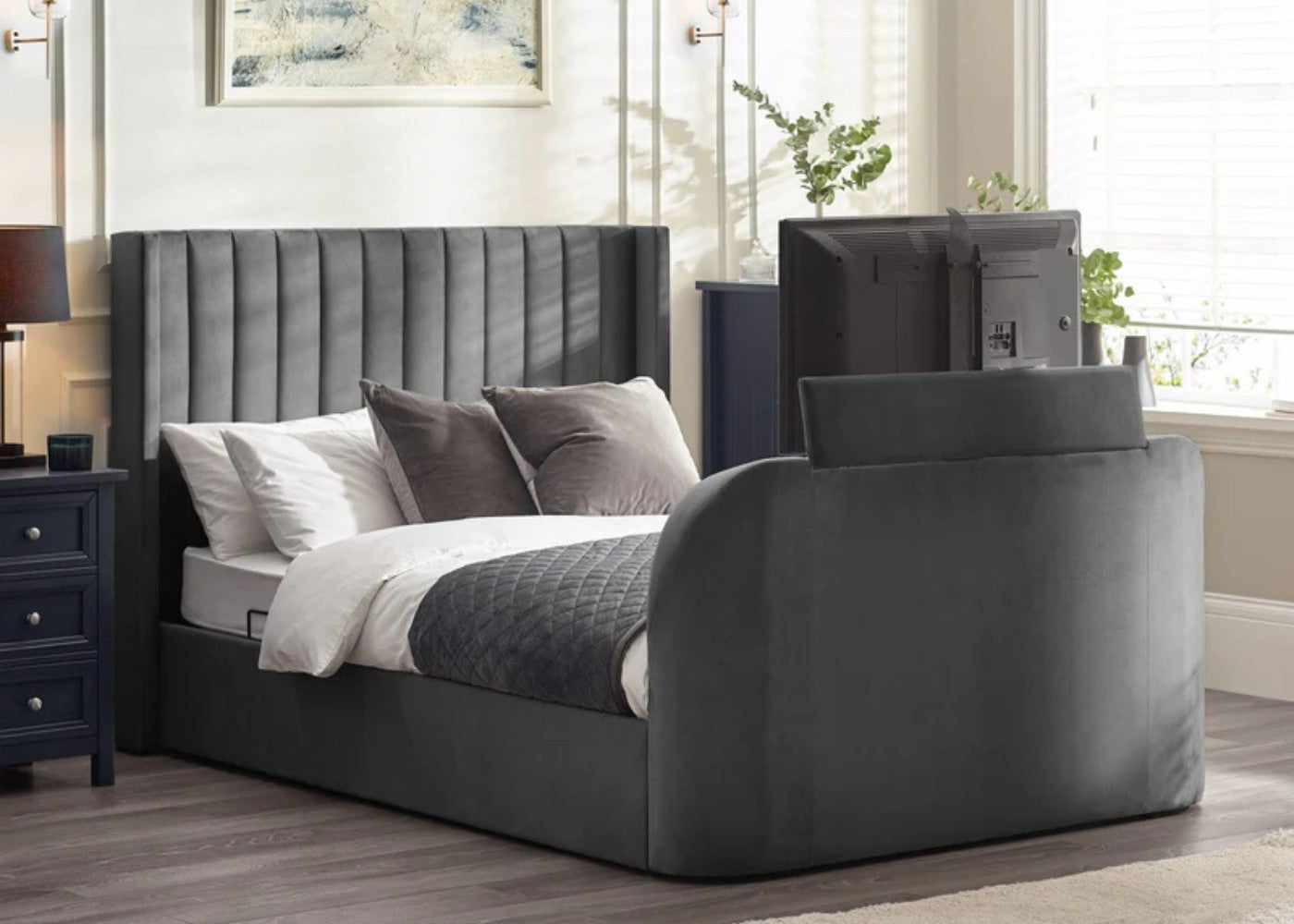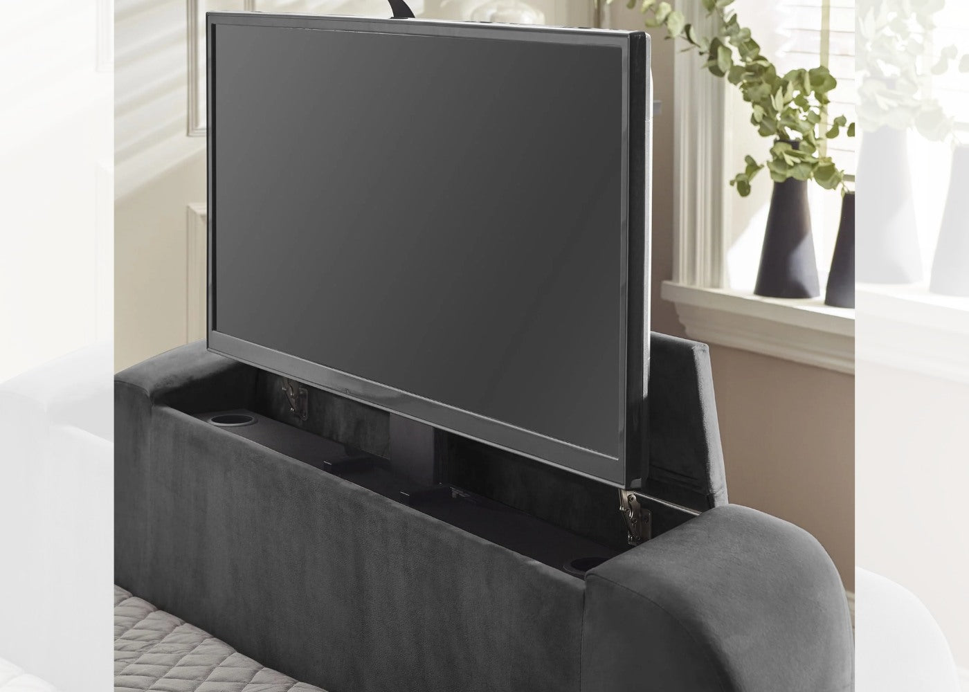 The Clara Side Lift Ottoman TV Bed showcases sleek modern style with a retro edge. Its storm-grey lacquer finish and softly rounded corners bring a calm, elegant look to bedrooms in and around King’s Lynn. Recessed detailing on the headboard and footboard ensures that the design remains subtle rather than busy, making this bed the perfect fit for both minimalist and contemporary spaces.