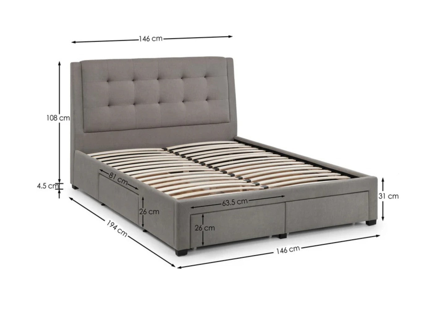 The Fullerton 4 Drawer Bed by Julian Bowen brings together style and sensible storage in a sleek, rounded design. Upholstered in a soft linen-effect fabric with black metal legs and a button-tufted headboard, it adds a subtle touch of sophistication to a home in and around your home. It is available in navy blue or grey, which helps it complement a variety of interior décor styles.