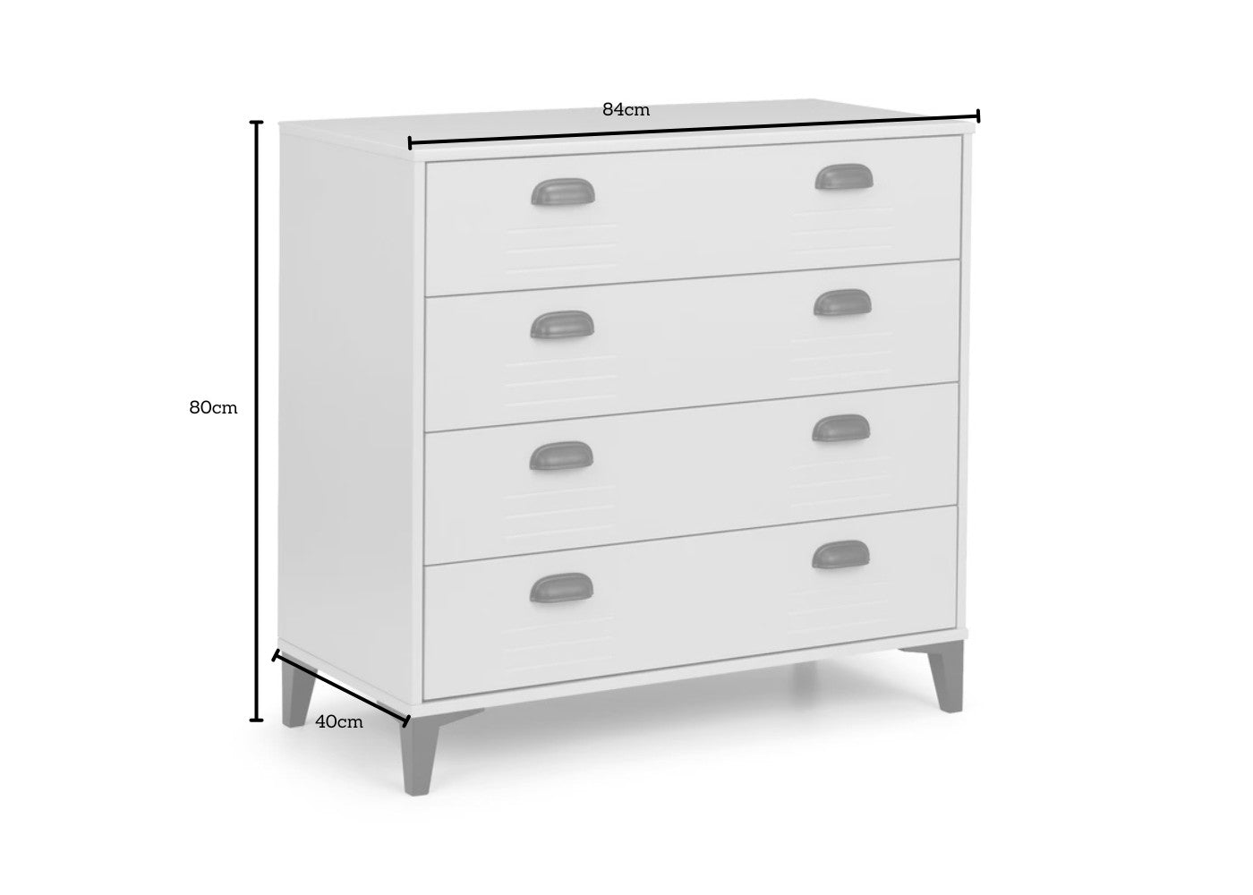 The Lakers Locker 4 Drawer Chest by Julian Bowen is a practical chest of drawers designed for everyday use. It offers functional storage while maintaining a clean and versatile appearance. It is available in Light grey.
