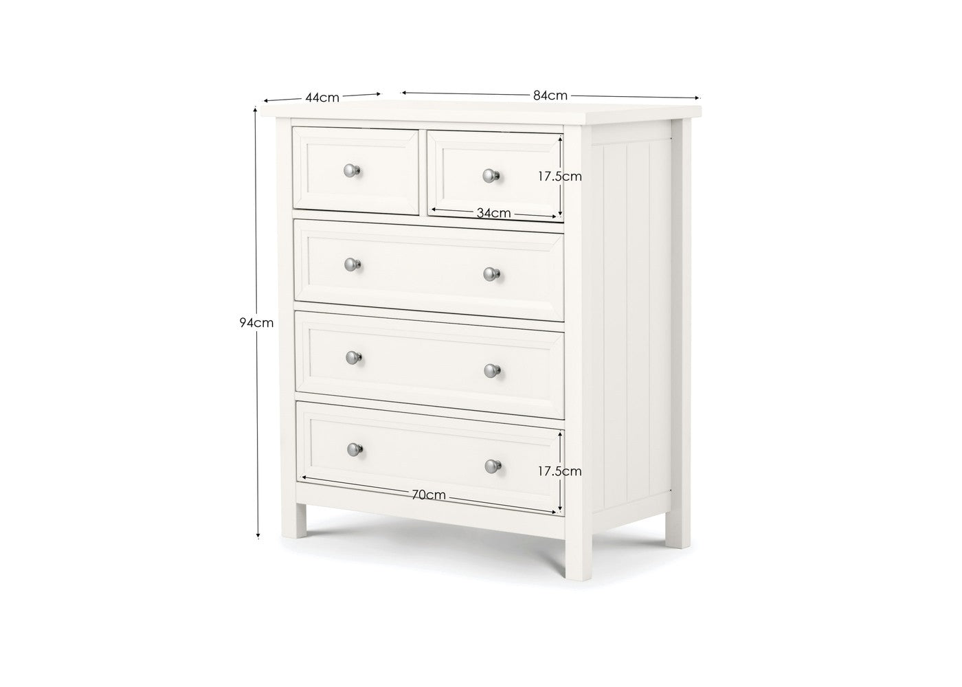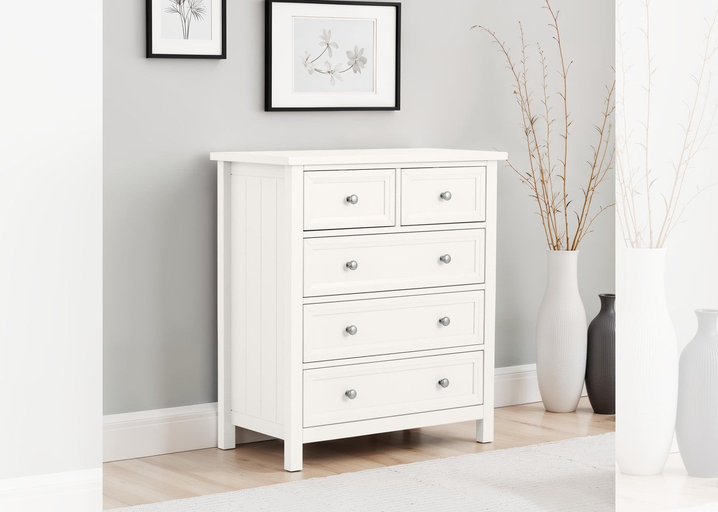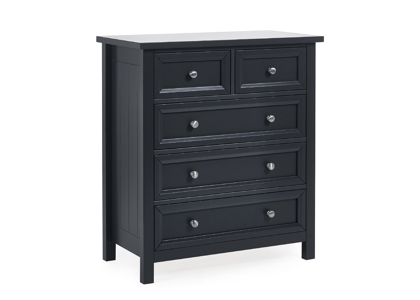 The Maine 3 + 2 Drawer Chest by Julian Bowen is a practical chest of drawers designed for everyday use. It offers functional storage while maintaining a clean and versatile appearance. It is available in Dove grey, Surf white and Anthracite.