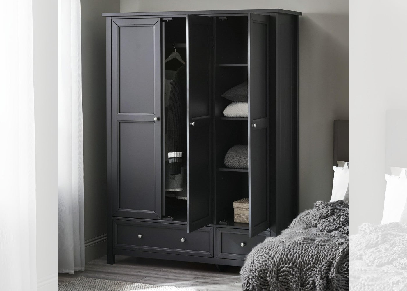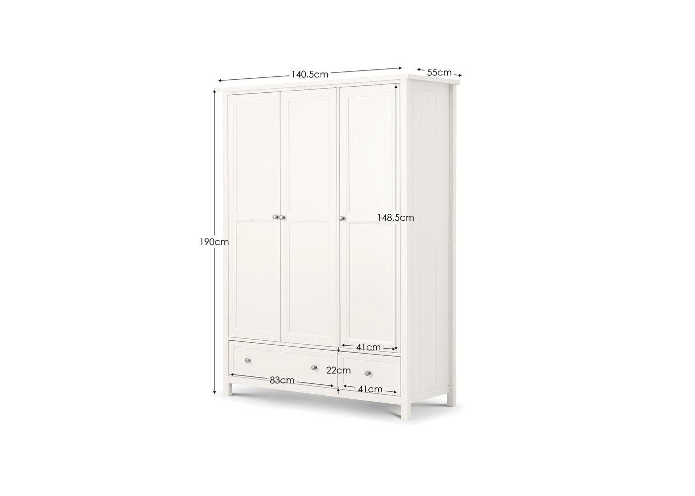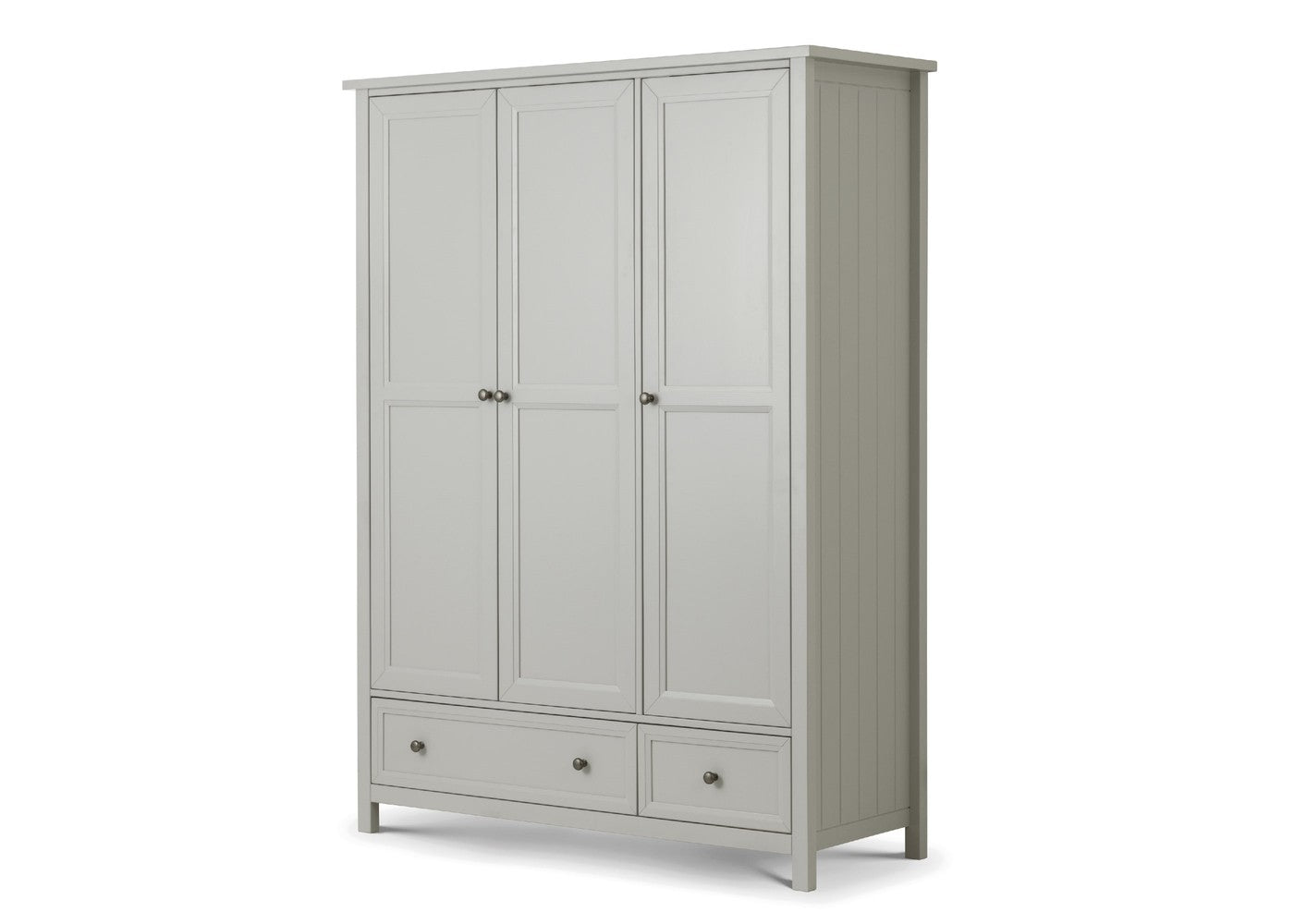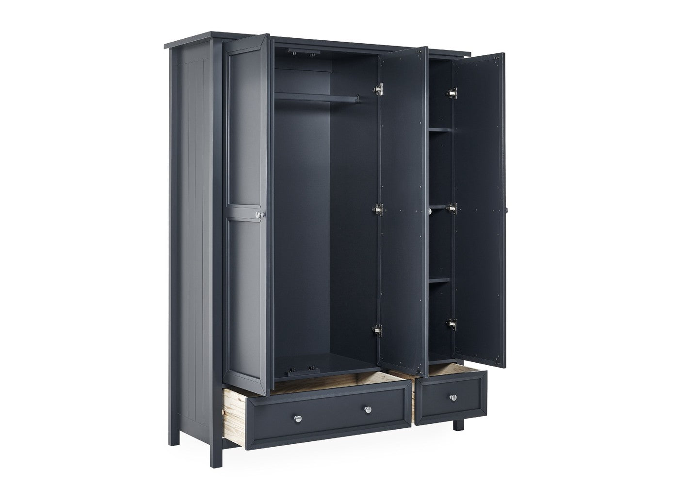 Behind the three doors, generous hanging space and thoughtfully arranged storage help keep your clothing neatly organised, complemented by two spacious lower drawers for folded items or accessories. Combining practical functionality with enduring charm, this wardrobe is a stylish solution for elevating your bedroom. To complete your space with matching furniture, explore more items in our bedroom furniture collection at West Norfolk Beds.