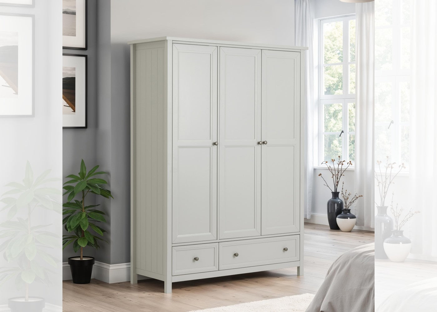 The Maine 3 Door Combination Wardrobe brings classic New England elegance to your bedroom, featuring a beautifully crafted design finished in a soft dove grey lacquer. Characteristic side panelling and detailed chamfered cabinetry create a refined and calming aesthetic, while the delicate pewter handles add a subtle touch of sophistication. Its timeless style blends seamlessly with both traditional and modern interiors, making it a versatile centrepiece for any room.