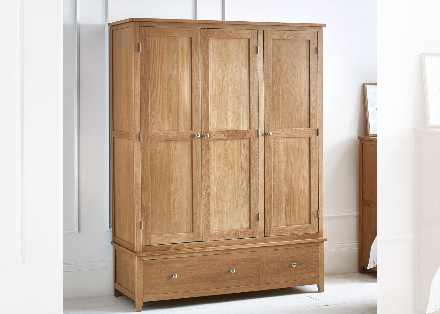 The Mallory 3 Door Wardrobe is crafted from solid oak and oak veneers, offering a beautiful combination of durability and timeless style. Its natural wood grain brings warmth and character to your bedroom, while the clean design ensures it suits both classic and contemporary interiors. Finished with elegant round silver knobs, this wardrobe adds a refined touch that enhances any bedroom space.