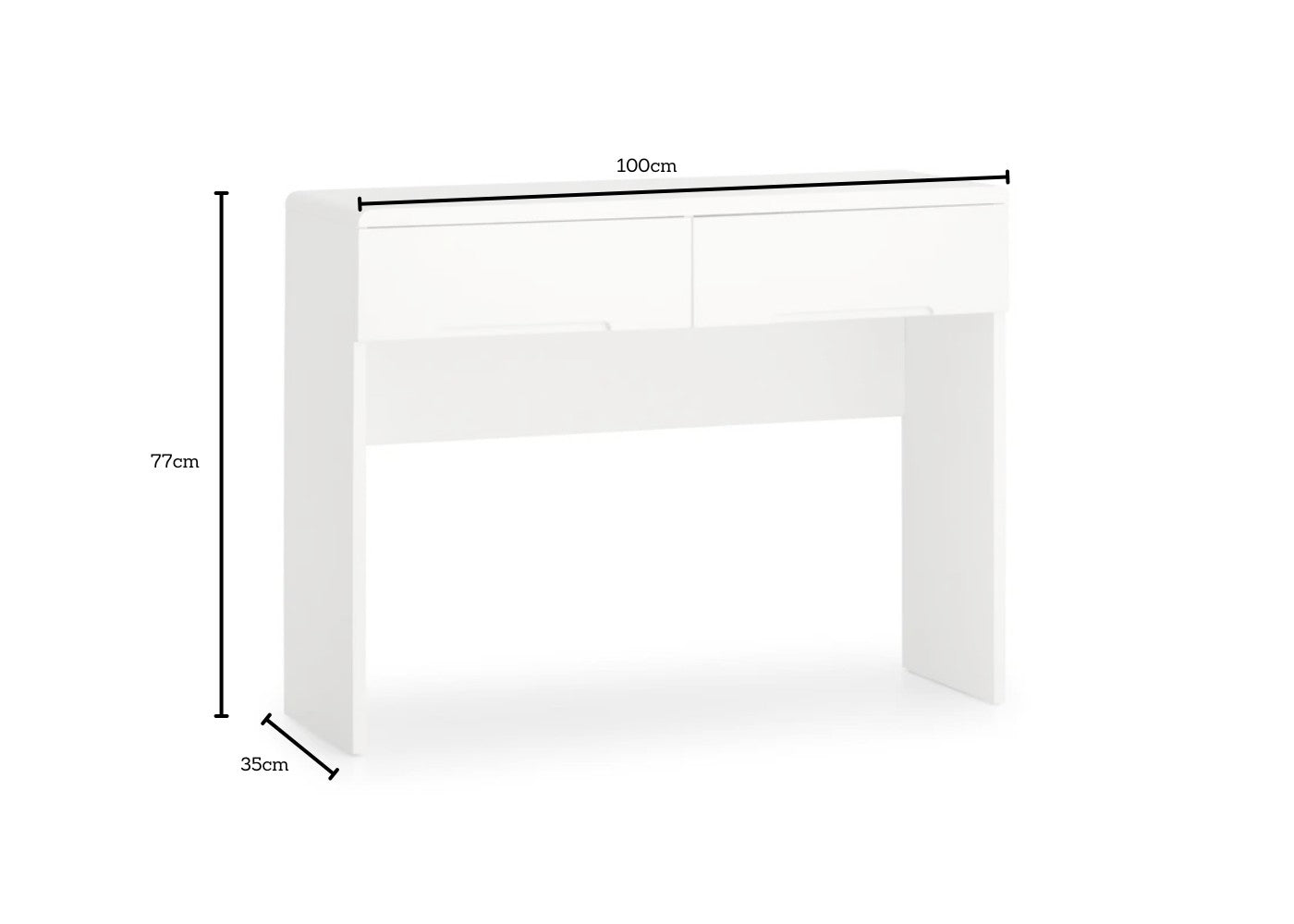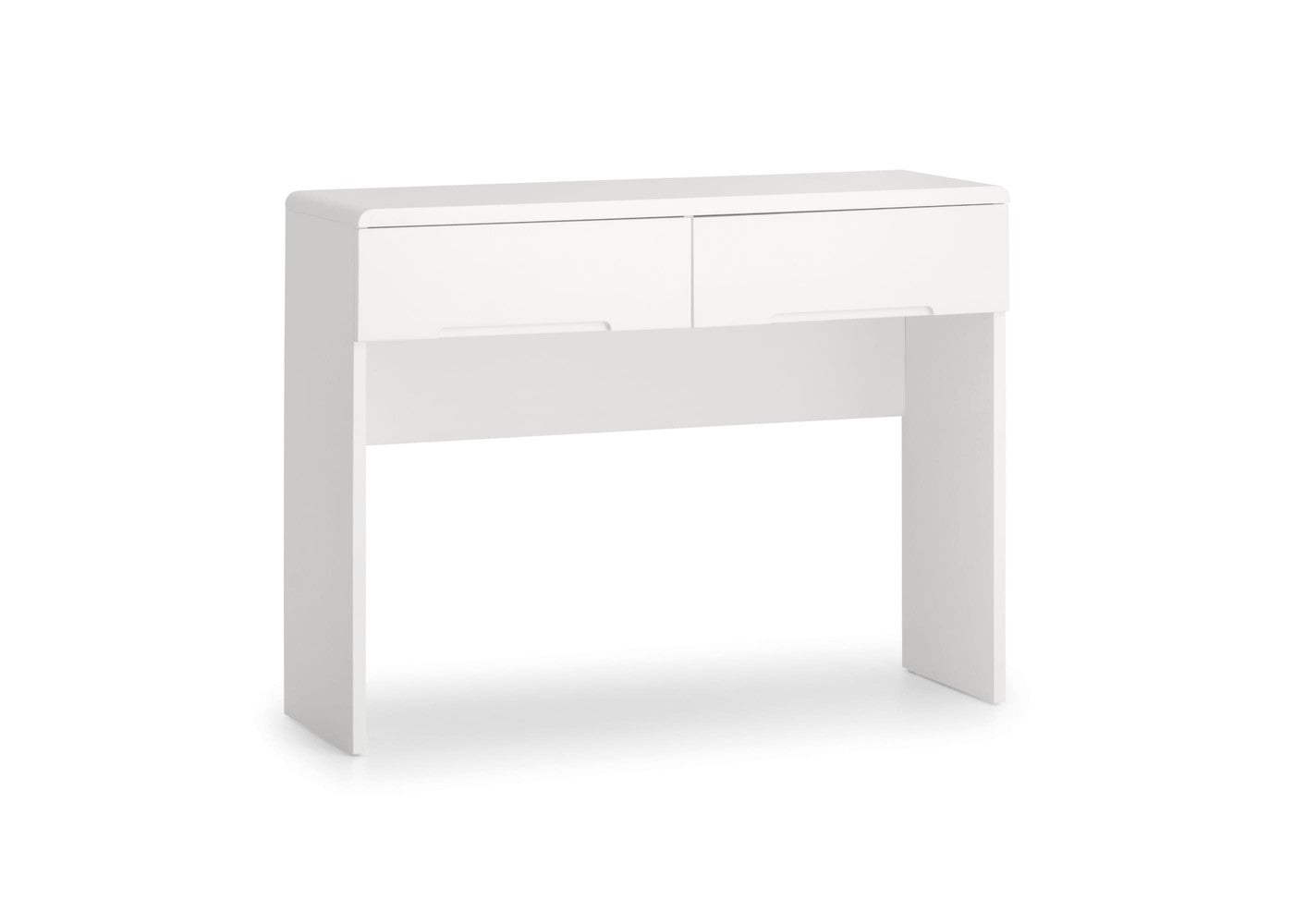 The Manhattan Dressing Table With 2 Drawers by Julian Bowen is a practical dressing table designed for everyday use. It offers functional storage while maintaining a clean and versatile appearance. It is available in White high gloss.
