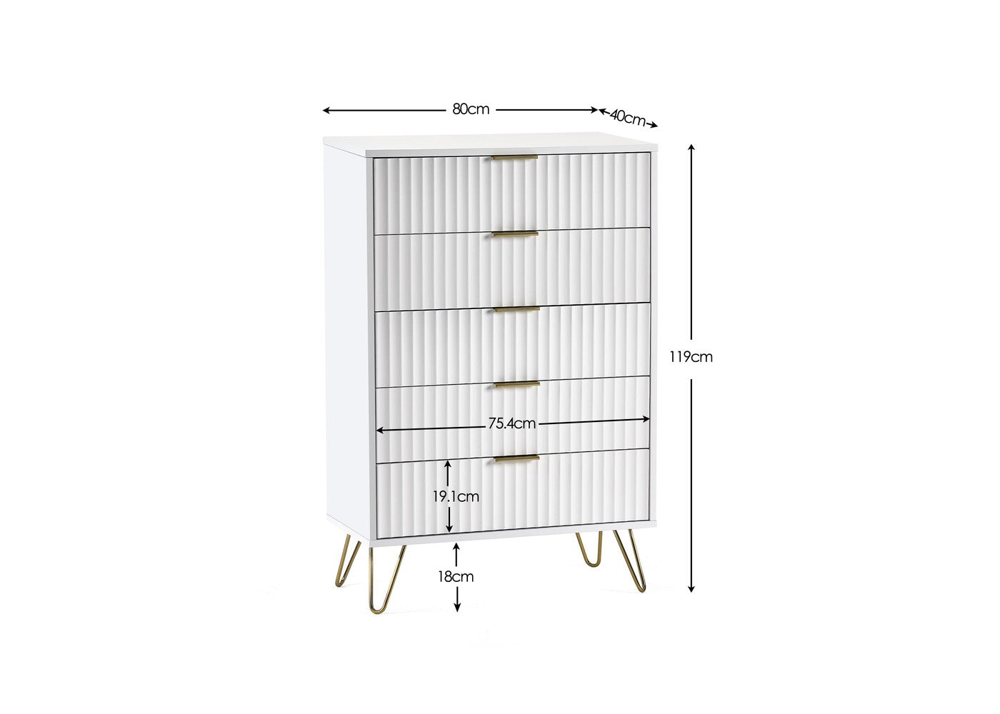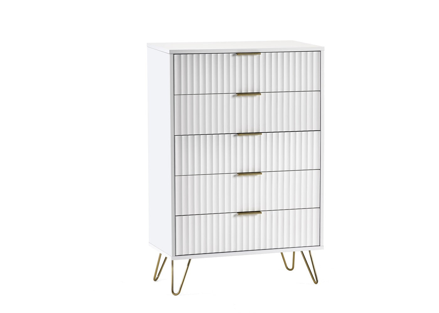 The Murano 5 Drawer Chest brings high end contemporary style to your bedroom with its striking sculpted drawer fronts – a standout design feature you simply do not want to miss. Inspired by chic, boutique style interiors, this piece is elevated by brushed gold accents that add a luxurious touch while remaining versatile enough to suit a wide range of décor themes. Finished in crisp white, it delivers a fresh, modern look that pairs beautifully with velvet beds or sofas for a truly sophisticated, designer feel.