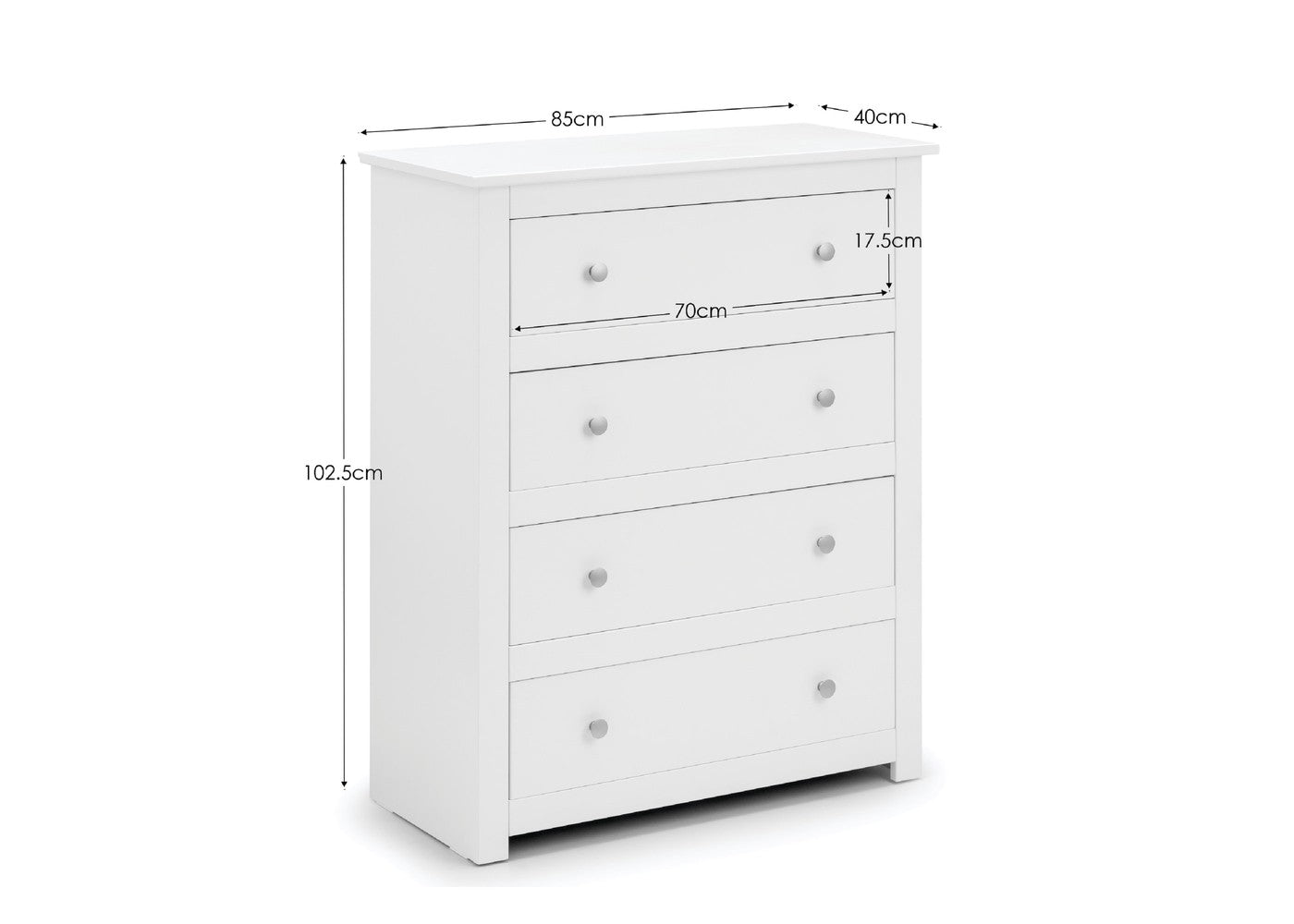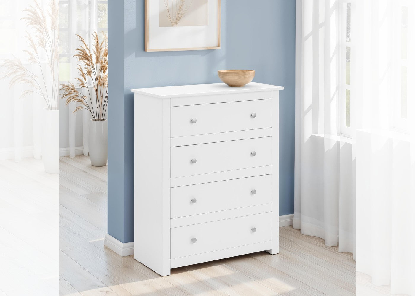 The Radley 4 Drawer Chest by Julian Bowen is a practical chest of drawers designed for everyday use. It offers functional storage while maintaining a clean and versatile appearance. It is available in Surf white and Anthracite.