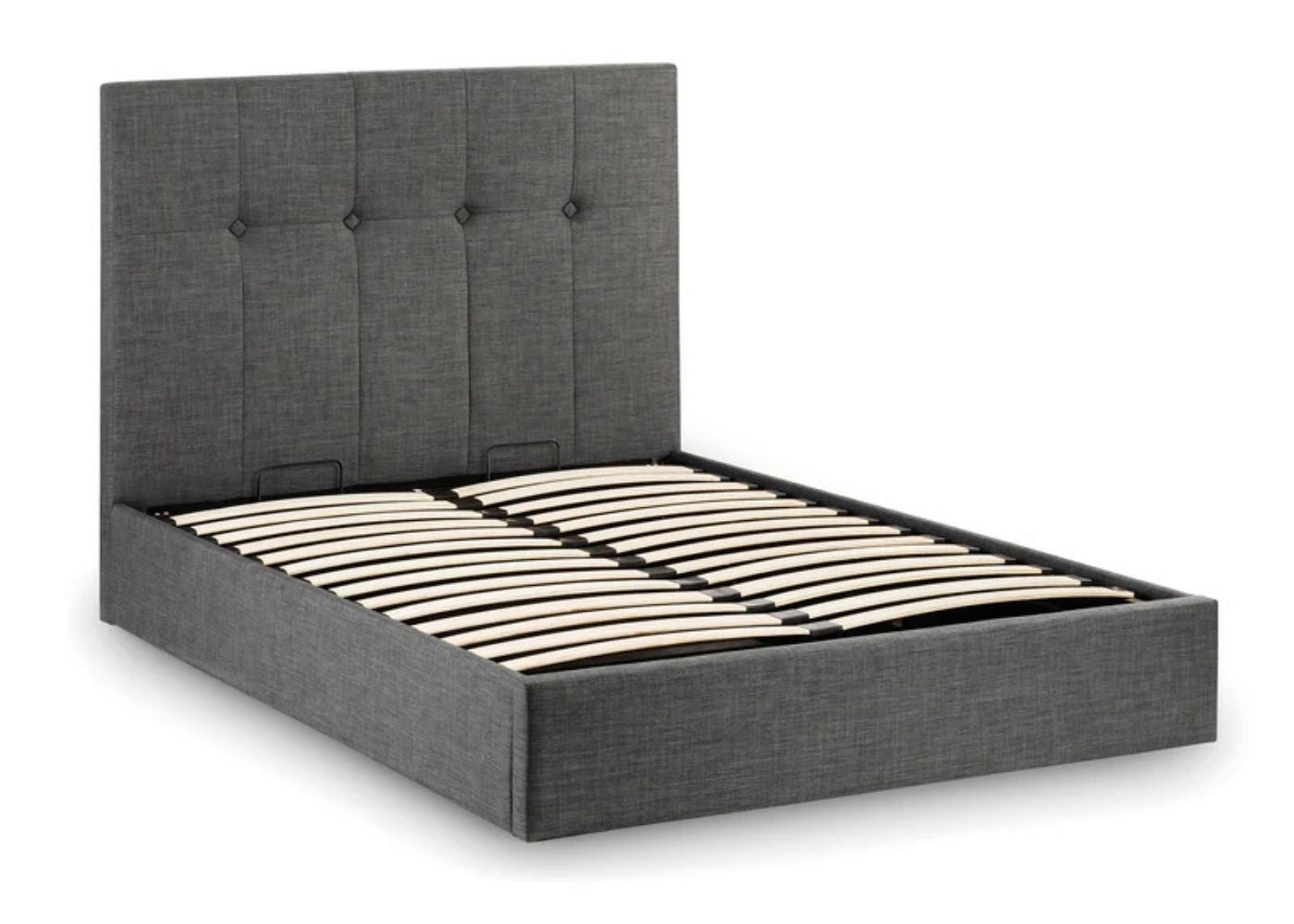 The Sorrento Lift-Up Storage Bed by Julian Bowen is beautifully upholstered in a refined slate-grey linen-effect fabric and features a bold high headboard with subtle diamond-pattern detailing for an elegant finish. Beneath the mattress platform, a gas-powered lift-up ottoman base reveals a generous hidden storage compartment, perfect for bedding, seasonal items or simply creating more space in a busy bedroom.
