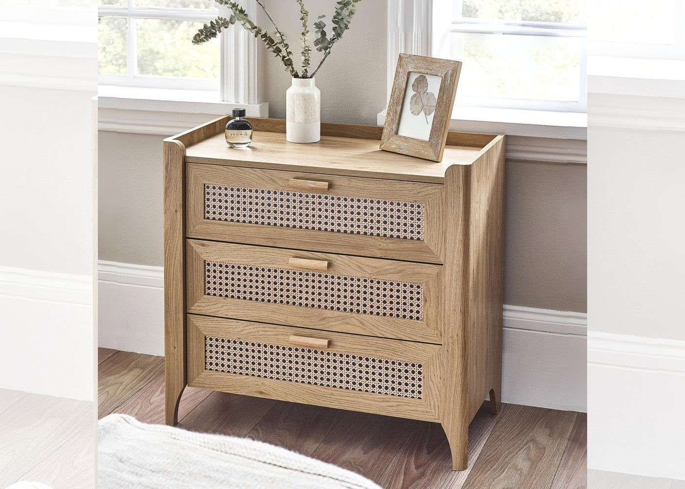 The Sydney 3 Drawer Chest showcases a beautifully sleek design with a soft bohemian touch, bringing an airy and inviting feel to your home. Its exquisitely curved edging and raised lip detailing create a refined silhouette, while the rattan-effect sticker front introduces natural texture and charm. Finished in a warm natural oak effect, this chest blends effortlessly with a variety of interior styles, making it a stylish and calming addition to any bedroom or living space.