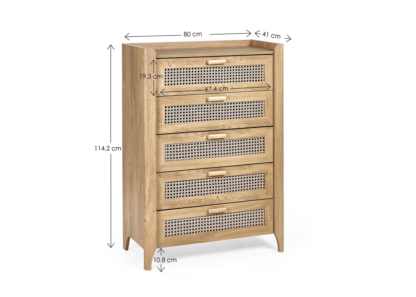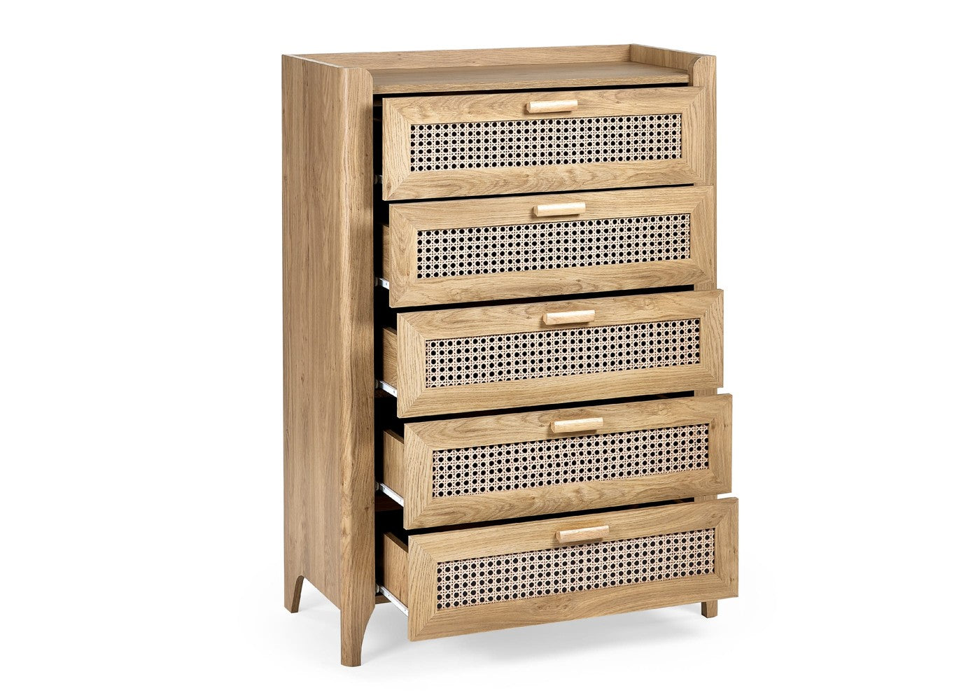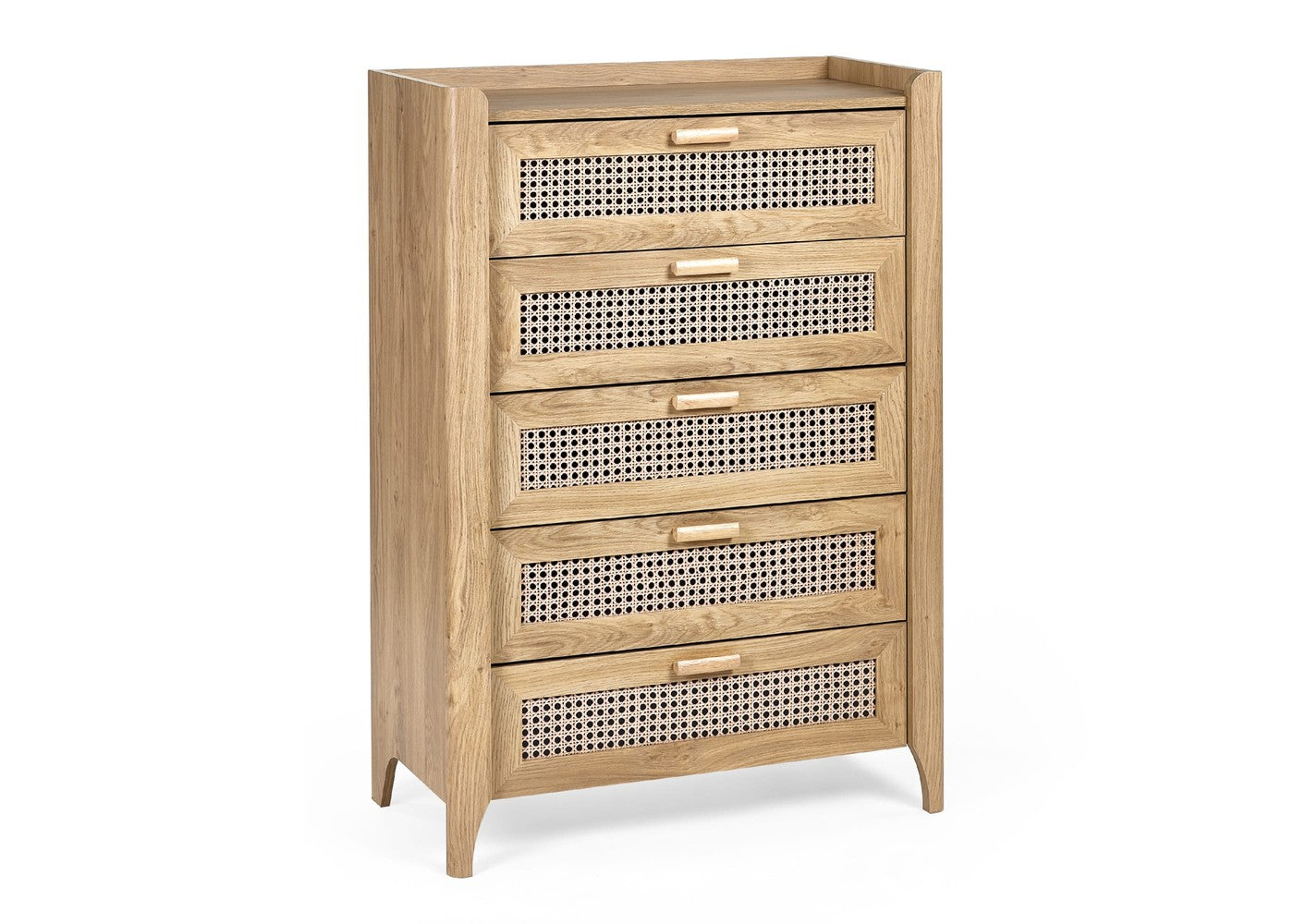 The Sydney 5 Drawer Chest brings together a beautifully sleek design and a relaxed bohemian feel, making it a standout addition to any bedroom or living space. Its exquisitely curved edging and raised lip detailing create a refined silhouette, while the rattan-effect sticker front adds natural warmth and texture. Finished in a soothing natural oak effect, this piece enhances your home with an airy, inviting atmosphere that blends effortlessly with a wide range of interior styles.