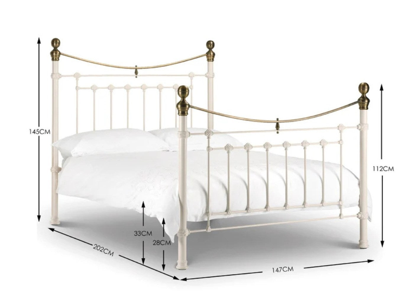• This is a traditional, Victorian inspired bedstead with attractive brass embellishments in a powder coated steel stone white finish..